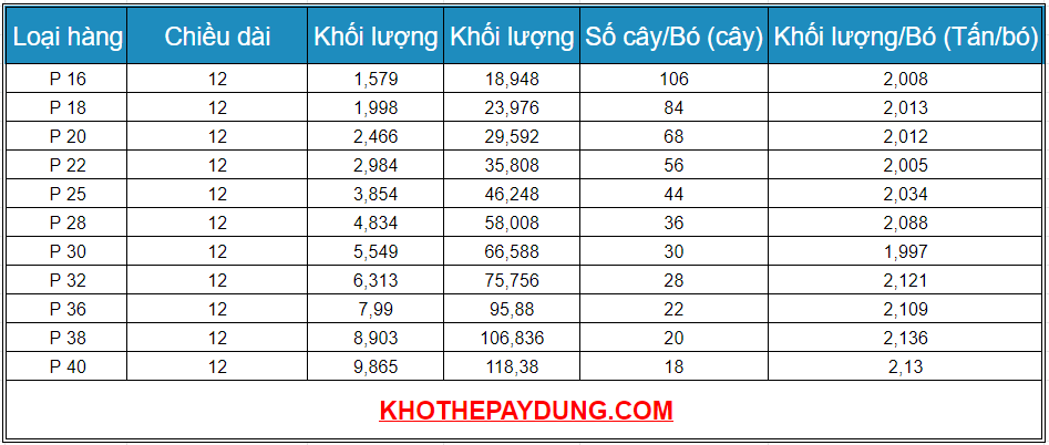 - Trọng lượng bó:     ~ 1000 kg (6m) ,  ~ 2000 kg (8.6m) ,   ~ 3000 kg (11.7m – 12m)