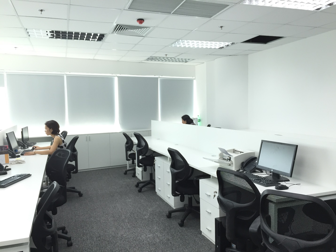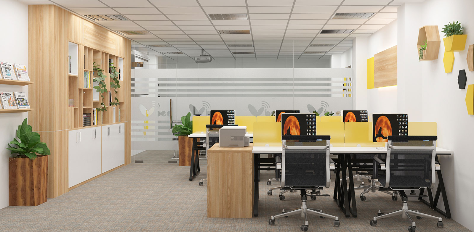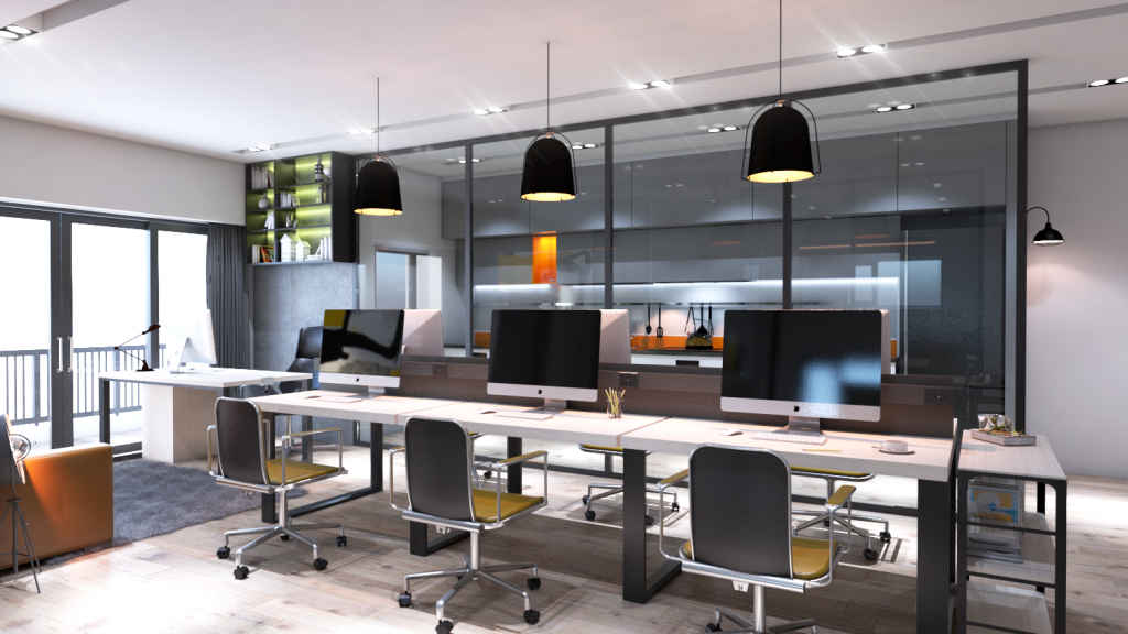 trường hợp tiếp theo, các doanh nghiệp cũng như công ty chiếm diện tích phòng hoạt động nhân viên khiêm tốn hơn. Họ lại dùng các bàn hoạt động thu được vách ngăn lửng để tạo không thể gian kết nối mà vẫn thu được góc làm việc riêng tư cho kĩ thuật viên. Màu sắc cho phòng làm việc nhân viên bởi thế chọn màu sắc nhẹ nhàng, tươi sáng để hài hòa cùng với ánh sáng.
